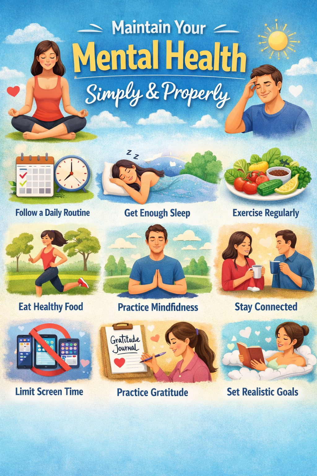 Maintaining mental health simply and properly means developing a healthy routine, taking care of your body, building positive relationships, and learning how to manage stress effectively. With consistent effort, anyone can improve their emotional well-being and lead a happier life.